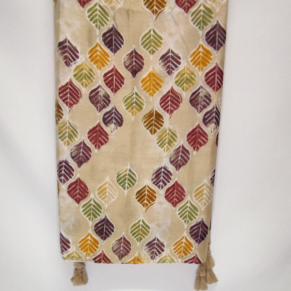 Cachecol em tons de azul escuro e bege, com bolinhas de várias cores, um modelo versátil para completar o seu look.